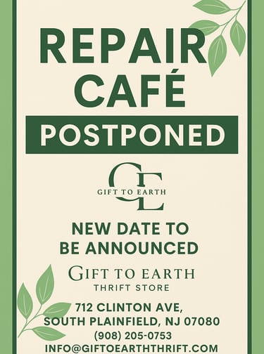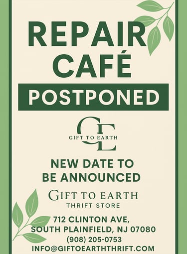 We regret to inform you that the upcoming Repair Café at Gift To Earth Thrift Store has been postponed. A new date will be announced as soon as possible. Thank you for your understanding and continued support!